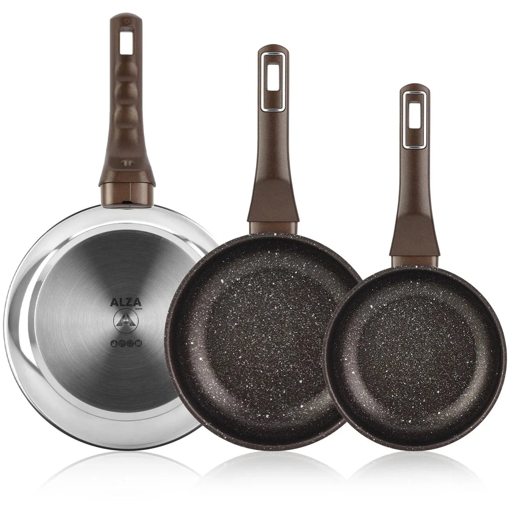 O conjunto PETREA oferece frigideiras de aço inoxidável de 20 cm, 24 cm e 28 cm, cobrindo todas as necessidades culinárias. O seu revestimento antiaderente de alta qualidade garante uma cozedura eficiente e uma limpeza simples. As pegas ergonómicas proporcionam conforto durante o uso. Compatível com todos os fogões, incluindo indução.