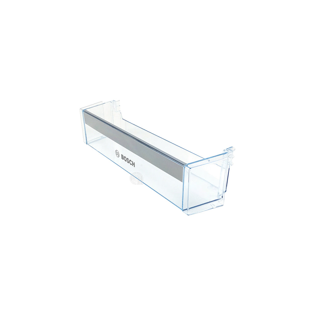 Balconeta ou prateleira para porta de frigorífico original Bosch, concebida para armazenar garrafas, frascos e outros alimentos na porta do frigorífico. Compatível com electrodomésticos de refrigeração das marcas Bosch e Siemens.