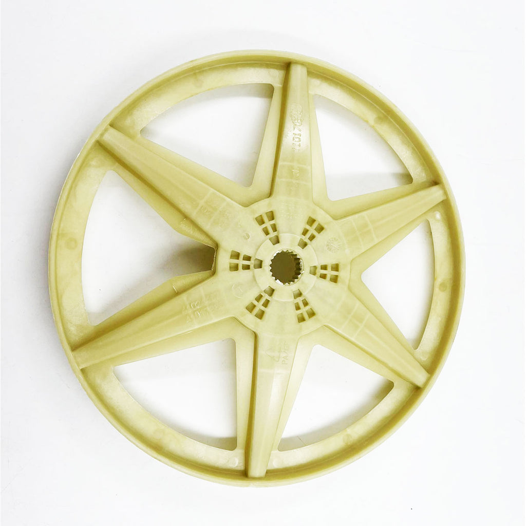 Polia do tambor da máquina de lavar Candy, Hoover. Peça de substituição para reparar a máquina de lavar. Esta peça sobresselente está associada à correia do aparelho para transmitir o movimento do motor para o tambor.