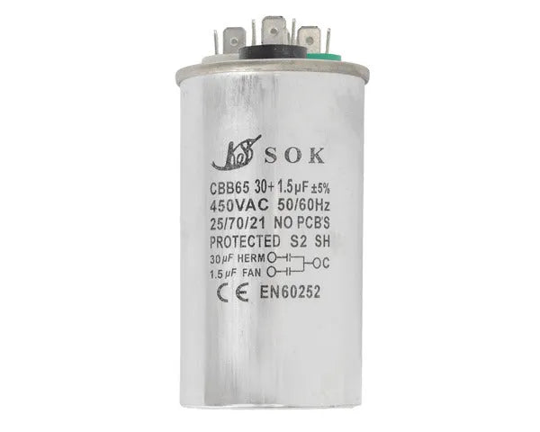 Este condensador de trabalho de 30µf + 1,5µf e 450V é um componente essencial para o correcto funcionamento de uma vasta gama de sistemas de ar condicionado. Concebido para oferecer um desempenho fiável e duradouro, assegura uma fonte de energia estável e constante, optimizando a eficiência dos motores do ventilador e do compressor.