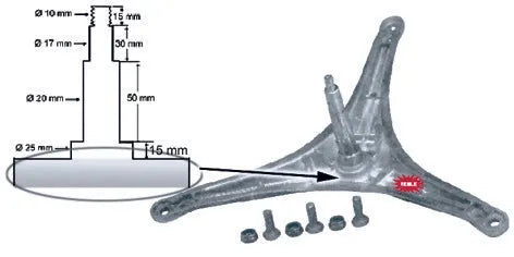 • Bucha: 25 mm, centro: 19 mm, extremidade: 13 mm, altura: 118 mm