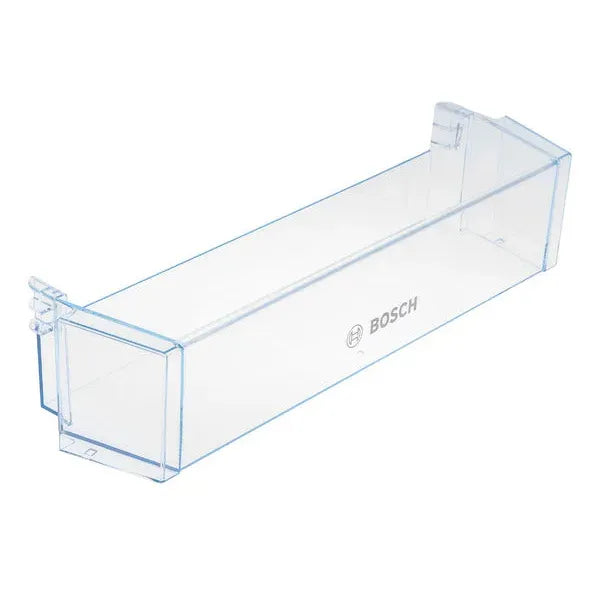 Esta prateleira para garrafas é uma peça de substituição concebida para frigoríficos Bosch e Siemens, que se instala no interior do frigorífico para suportar garrafas e outros recipientes de forma segura e organizada. Fabricada em plástico transparente resistente, permite uma visualização correta do conteúdo e facilita a organização dos alimentos.