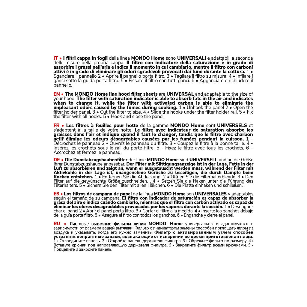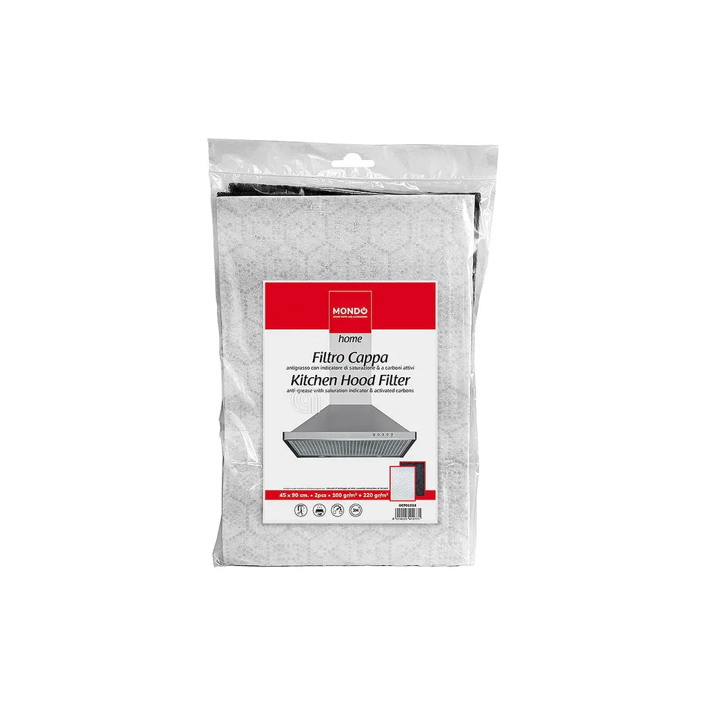 Filtro de gordura e filtro de carvão ativo de 45x90 cm para exaustores, modelo original Mondo com código 00701024. Este conjunto inclui um filtro de gordura com detector de saturação e um filtro impregnado com carvão ativo, concebido para manter o ar limpo e evitar a acumulação de gordura no sistema de extração.