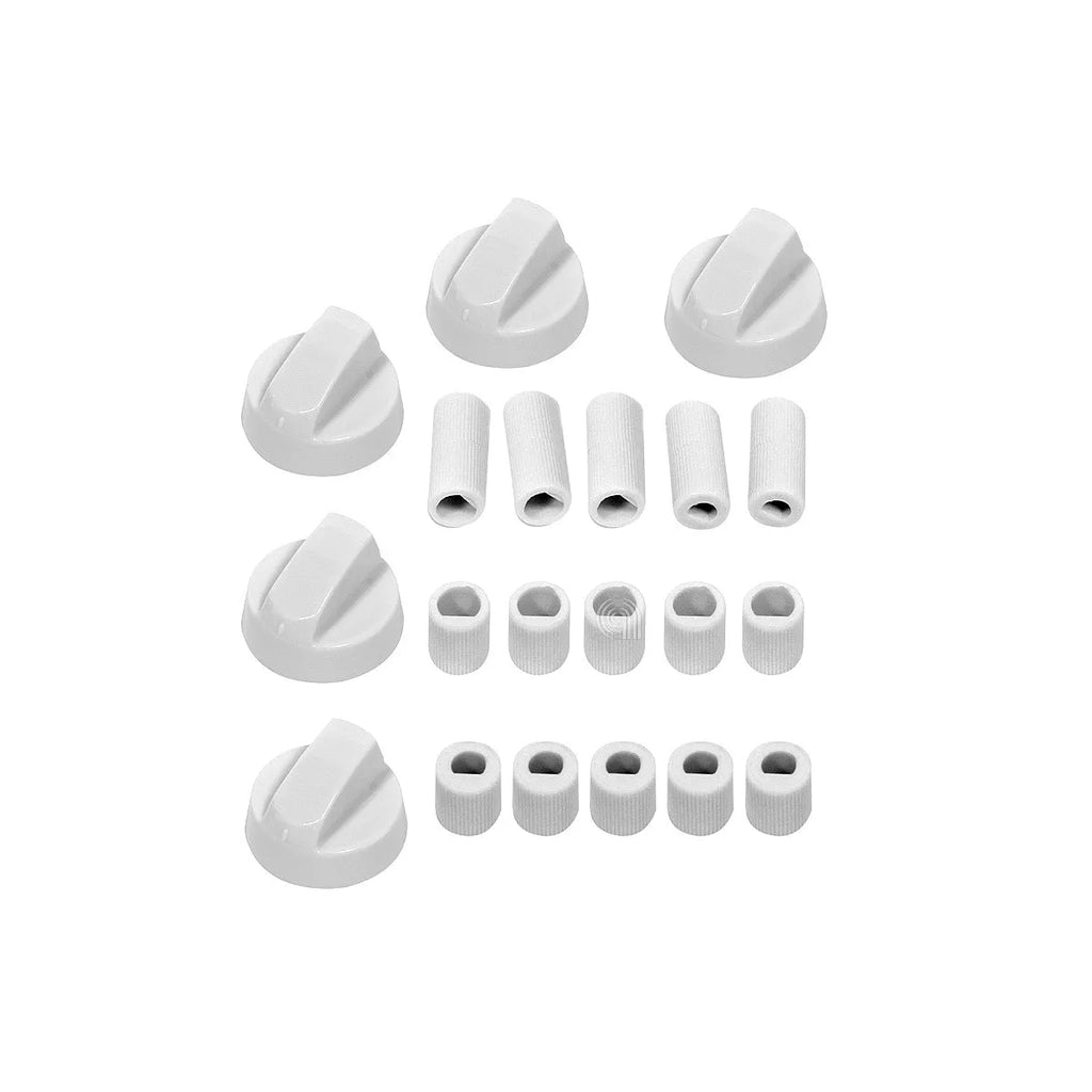 Kit de 5 botões universais brancos para forno e placa de cozinha, da marca UNIVERSALE. Este conjunto adaptável inclui adaptadores para diferentes diâmetros de eixo, garantindo uma ampla compatibilidade com a maioria dos eletrodomésticos. Ideal para substituir botões desgastados ou perdidos, restaurando a funcionalidade e a estética da sua cozinha. Fabricado com materiais resistentes para maior durabilidade e fácil instalação.