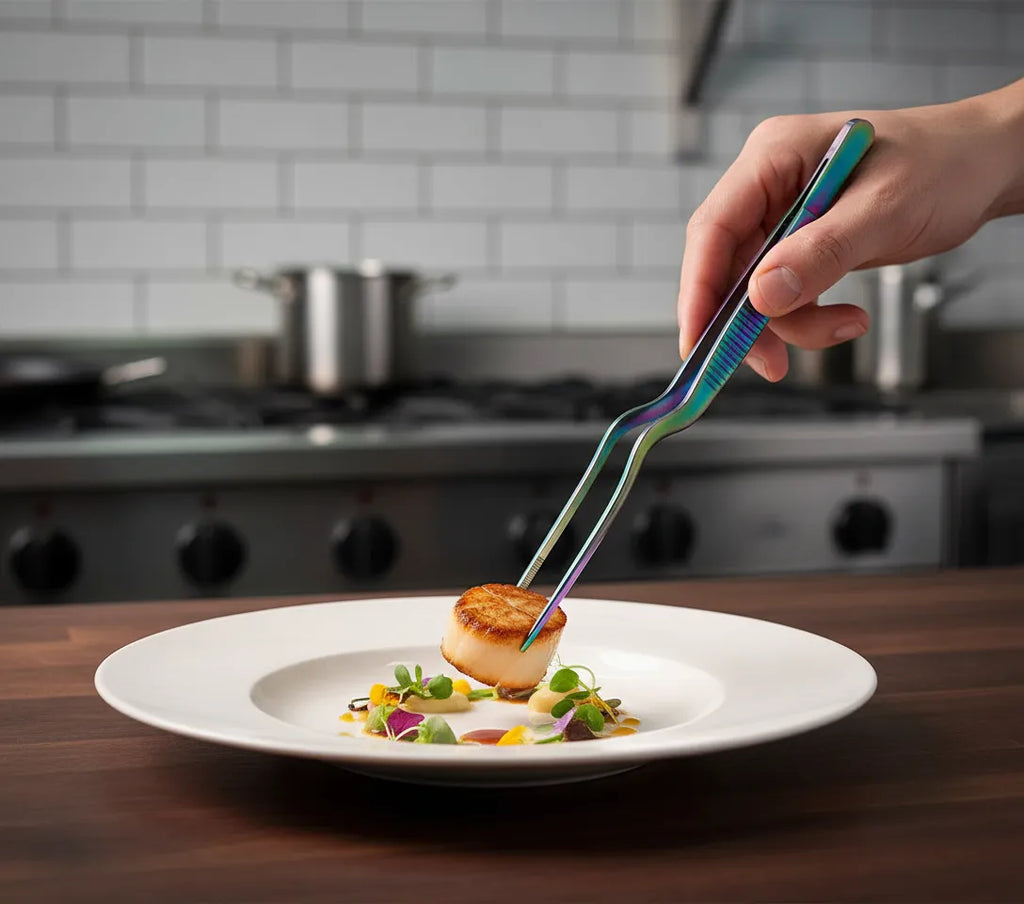 A pinça de precisão TITAN RAINBOW LACOR combina funcionalidade profissional com um acabamento espetacular em titânio arco-íris. Fabricada em aço inoxidável 18/10 de máxima qualidade, é a ferramenta perfeita tanto para chefs profissionais como para cozinheiros caseiros que procuram estilo e desempenho.