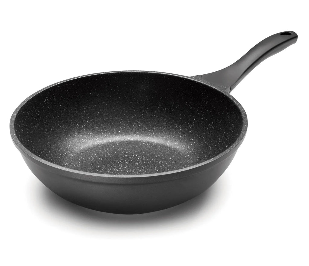 A base de alumínio permite uma distribuição homogénea do calor, permitindo que os alimentos cozinhem rapidamente e de forma uniforme, quase sem utilizar óleo.