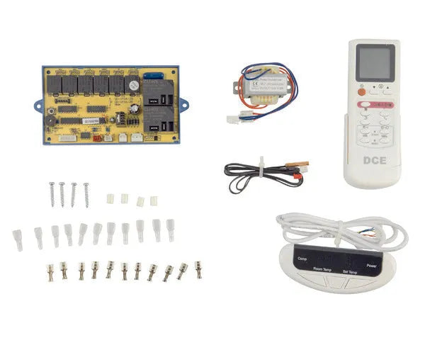Este módulo electrónico universal, modelo DCE111A, está concebido para o controlo de aparelhos de ar condicionado do tipo liga/desliga. Proporciona uma solução completa para a gestão do sistema, incluindo funções de arranque automático, controlo do compressor, ventilador interior de três velocidades, ventilador exterior e válvula de 4 vias.