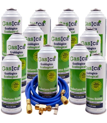 GASICA D2 R600A - Pack 12 Botellas + Manguera SAE 1/4"x1/4" + Válvula - La solución profesional definitiva para talleres y técnicos especializados que combina máximo rendimiento con respeto absoluto al medio ambiente.