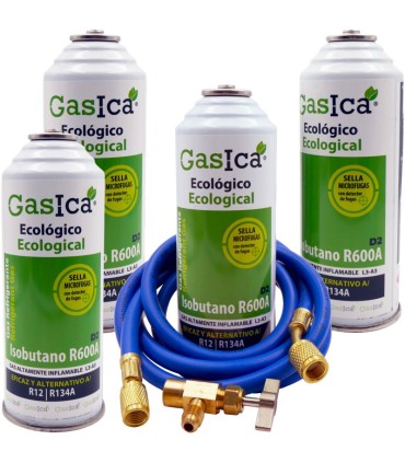 El gas refrigerante GASICA D2 (R600A - Isobutano) es una solución profesional diseñada como sustituto eficiente de los refrigerantes R12 y R134a. Este pack completo de 4 botellas incluye manguera de carga SAE 5/16"x1/4" de 1500mm y válvula de servicio, ofreciendo todo lo necesario para trabajos de refrigeración y climatización.