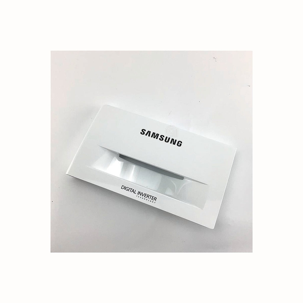 Este painel puxador é uma peça original de substituição para máquinas de lavar Samsung, concebido para facilitar a abertura do compartimento do dispensador de detergente e amaciador em modelos específicos das séries WW3000J e WW5000J.