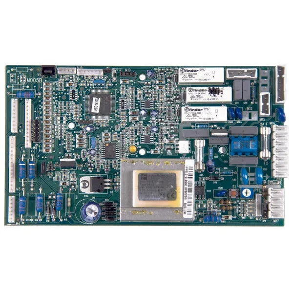 Esta placa eletrónica é um módulo de controlo para caldeiras Beretta, modelo MC13FN, que gere o funcionamento e a segurança do sistema de aquecimento. Controla a ignição, a modulação do queimador e a gestão dos sensores, assegurando um funcionamento eficiente e seguro da caldeira.
