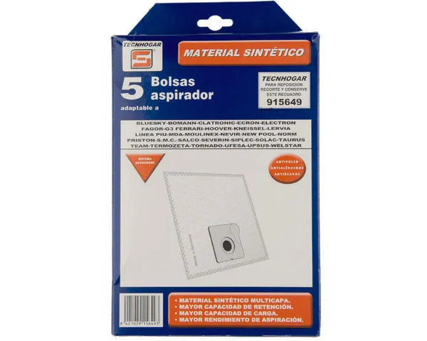 Saco aspirador sintético multimarca 5 unid. Mod. HVC40BA14. C.O. 915649. BLUESKY, BOMANN, CLATRONIC, ECRON, ELECTRON, FAGOR, G3 FERRARI, HOOVER, KNEISSEL, LERVIA, LINEA PIU, MDA, MOULINEX, NEVIR, NEW POOL, NORM, PRISTON, S.M.C., SALCO, SEVERIN, SIPLEC, SOLAC, TAURUS, TEAM, TERMOZETA, TORNADO, UFESA, UPSUS, WELSTAR.