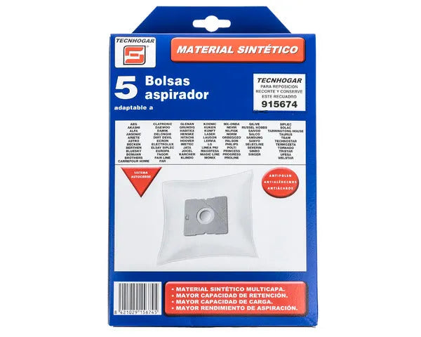 Saco aspirador sintético multimarca 5 unidades. C.O. 915674 Mod. HVC10BA14. AEG, AKASHI, ALFA, ANSONIC, ARIETE, ASTRO, BERTHEN, BLUESKY, BOMANN, BROTHERS, CARREFOUR, CLATRONIC, DAEWOO, DAMIK, DELONGHI, DIRT DEVIL, ECRON, ELECTROLUX, EUROPA, FAGOR, FAR, GLENAN, GRUNDING, JATA, KARCHER, KUNFT, LERVIA, LG, LINEA PIU, MAGIG LINE, MONIX, MX ONDA, NEVIR, NILFISK, NORM, ORBEGOZO, PHILIPS, PRINCESS, PROGRESS, PROLINE, RUSSEL HOBBS, SAIVOD, SALCO, SAMSUNG, SANYO, SELECLINE, SEVERIN, SOGO, SOLAC, TURUS, TEAM, TERMOZETA, TORNADO, TRISTAR, UFESA, WELSTAR.