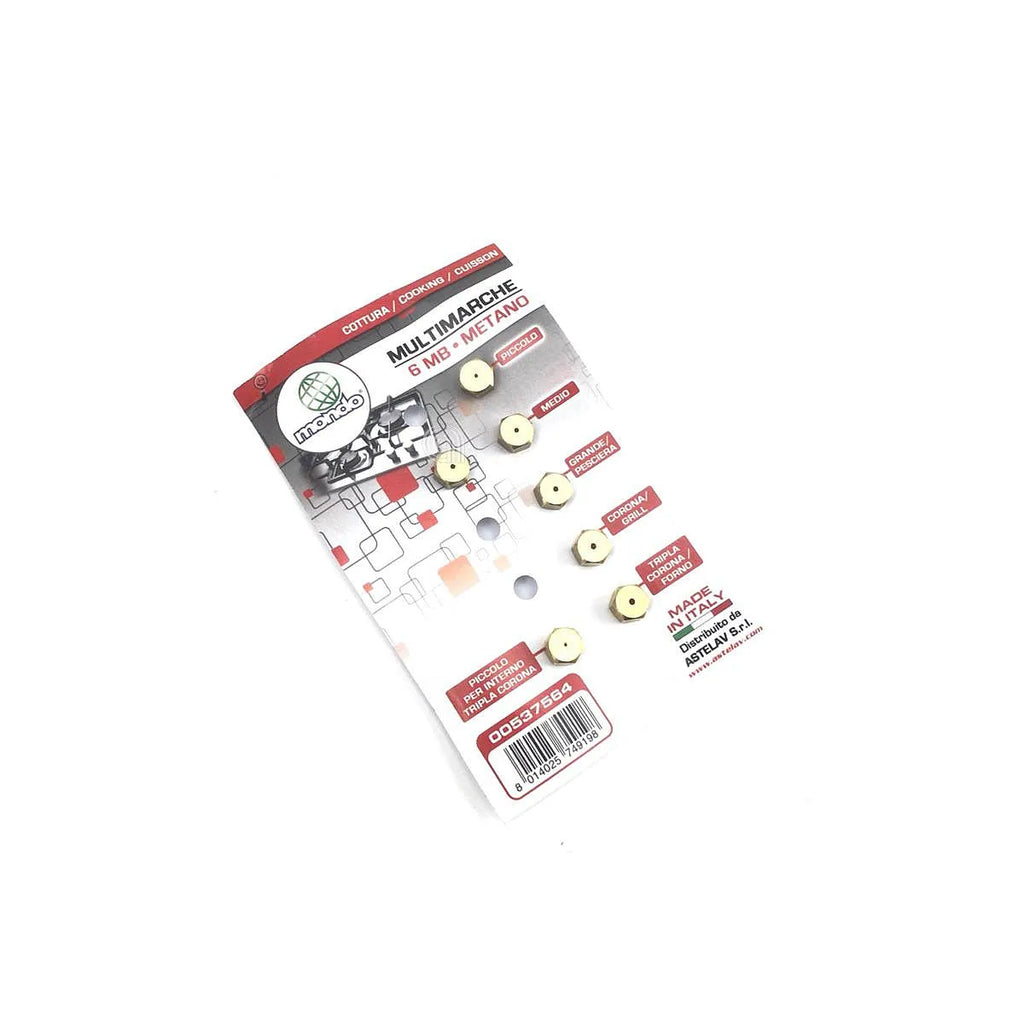 Este conjunto de 7 bicos de gás metano 6MB, compatível com as marcas UNIVERSALE, MONDO, é uma peça de substituição adaptável ideal para placas de cozinha. Projetado para gás natural, inclui injetores para diferentes queimadores, garantindo uma combustão eficiente e segura. Perfeito para manter o seu eletrodoméstico a funcionar de forma ótima. Os bicos são universais e adaptam-se a uma ampla gama de modelos de placas, proporcionando uma solução prática e económica para a manutenção da sua cozinha.