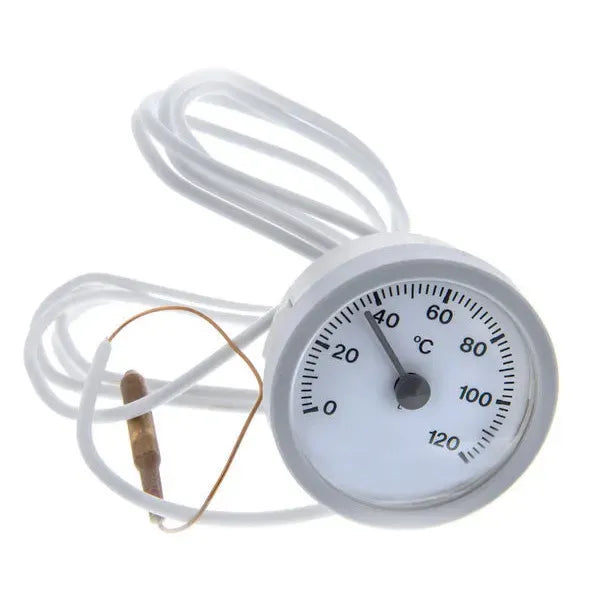 O termohidrómetro é um instrumento de controlo que mede simultaneamente a pressão e a temperatura da água em caldeiras. Esta peça de substituição é essencial para garantir o correto funcionamento e a segurança da caldeira, ao fornecer leituras precisas que permitem detetar anomalias no sistema.